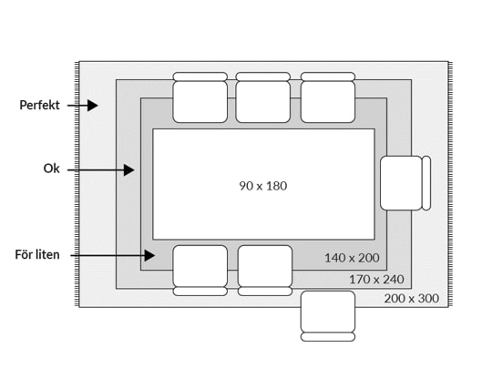 Asia, jonka monet unohtavat ruokaryhmälle mattoa valitessaan, on se, että ajattelet vain pöydän mittoja, etkä laske tuoleja. Muista siis, että haluat vetää tuolin ulos ilman, että jalat päätyvät maton reunan ulkopuolelle. Siksi suosittelemme, että matto on 50-60 cm pidempi kuin ruokapöytä, jotta voit sijoittaa tuolit lyhyille sivuille ja käyttää myös välilevyä. Valitse matto, joka on saman muotoinen kuin pöytäsi.