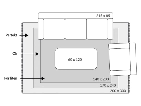 Sohvaryhmän mattoa valittaessa sen tulee olla vähintään yhtä leveä kuin sohvasi, mutta suosittelemme, että matto on leveämpi, jotta se tuntuu mukavammalta. Aseta matto hieman sohvan alle, jotta se pysyy osittain paikoillaan, mutta myös luodaksesi harmonisemman ilmeen. Harkitse myös hieman suuremman maton valitsemista, jos sinulla on nojatuolit tai kulmasohva koko huonekalun kehykseksi.
