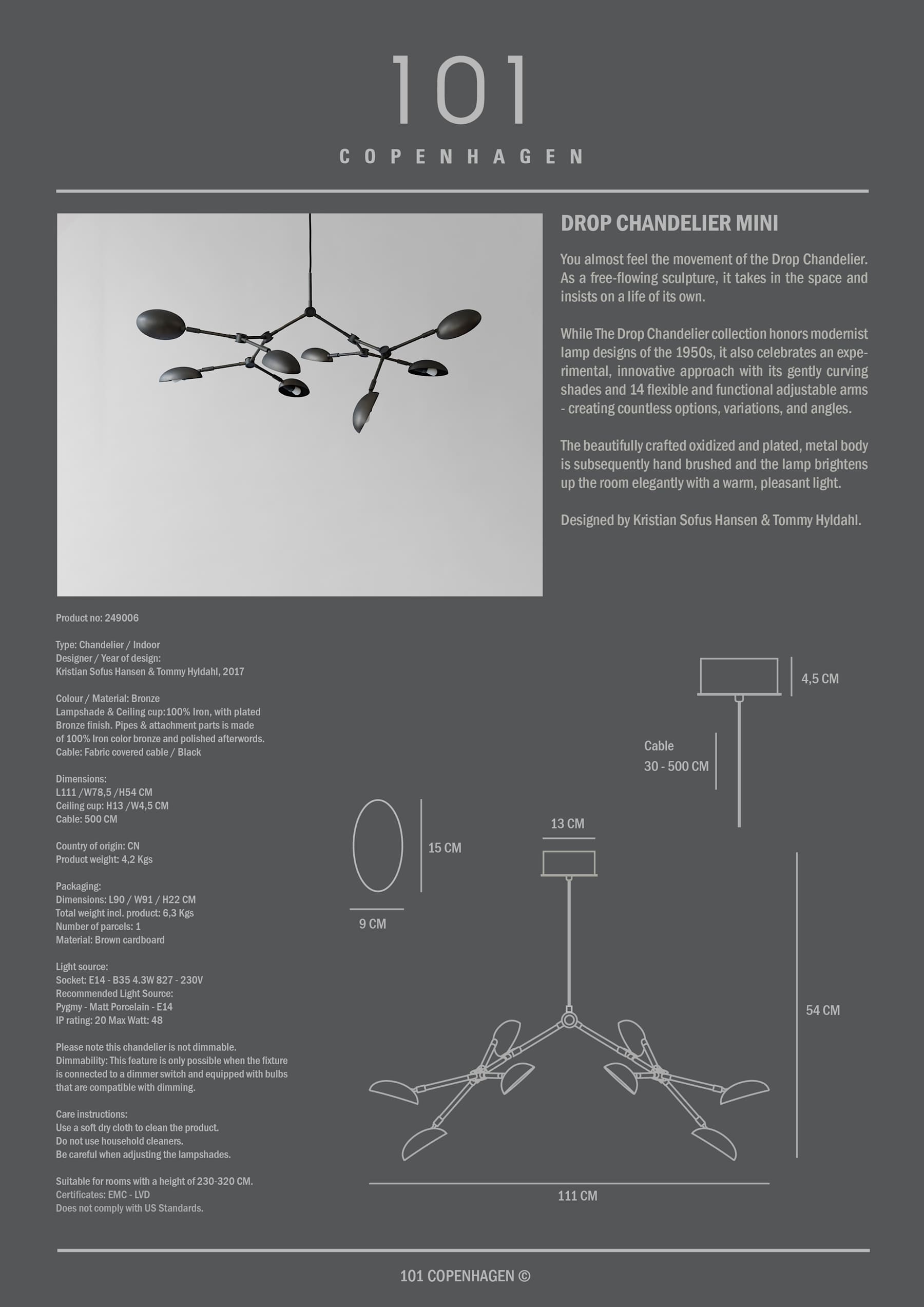 Kattokruunun kaarevat varjostimet tuottavat pehmeän ja runsaan valon, joka luo tunnelmaa niin yksityisiin kuin julkisiin tiloihin. Drop Chandelier on saatavana raakana hapetetussa pinnassa sekä kolmessa ylellisessä metalliviimeistelyssä – messinki, pronssi ja burnt black. Jokainen metallirunko on huolellisesti käsin harjattu korostamaan materiaalin ainutlaatuista rakennetta ja käsityöhenkeä.