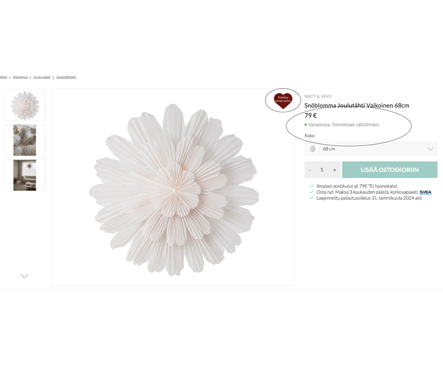 Osta joululahjasi viimeistään 14. joulukuuta (koskee toimitusta noutopisteeseen) tai 14. joulukuuta (koskee kotiinkuljetusta) varmistaaksesi toimituksen ennen jouluaattoa. Tämä koskee tuotteita, joiden toimitusaika on "Varastossa. Lähetetään välittömästi" ja jotka on merkitty punaisella "Toimitus ennen joulua" sydänsymbolilla.